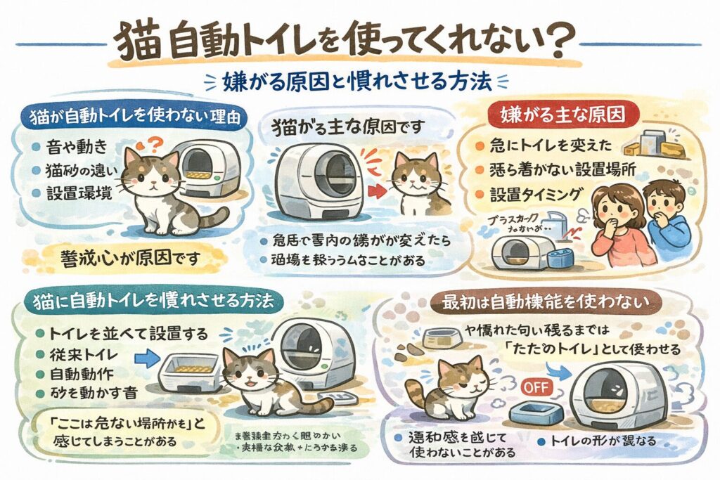 猫が自動トイレを使わない場合、警戒心や環境の変化が原因になっていることが多いです。